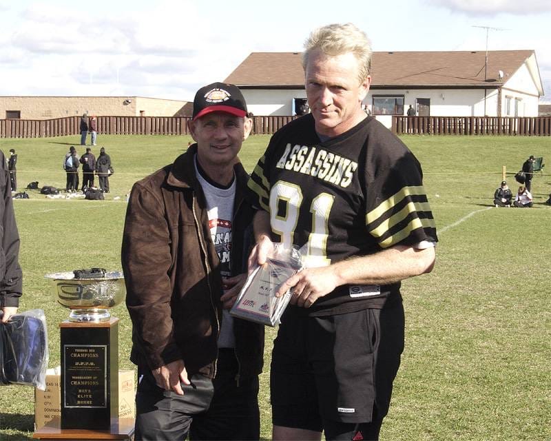 Player bio: I began playing with the Assassins in 1979 as my two older brothers helped start the team the previous year. I was honoured to play with a group of guys who enjoyed the dedication, competition and rivalry that embodied the Assassins. I have to say that the reason the Assassins were the best team ever in Manitoba was because we had the best players and the best QB in #11 Tim Shea! Every year we would practice regularly so we could compete during the May long weekend at the Tournament of Champions in Eastern Canada. We would return to Manitoba and be focused on the season and then the Labour Day Tournament in Saskatchewan. This led to the Provincials in Winnipeg and then Football Canada Touch bowl in various parts of in October. The rivalries and friendships we had with the Combines, the Ratz, the Nads, the Eagles, the Heat, the Avengers, and the Sun Parties provide very special memories. The lifetime bonds of friendships with teammates and the fun of the game was what it was all about.
